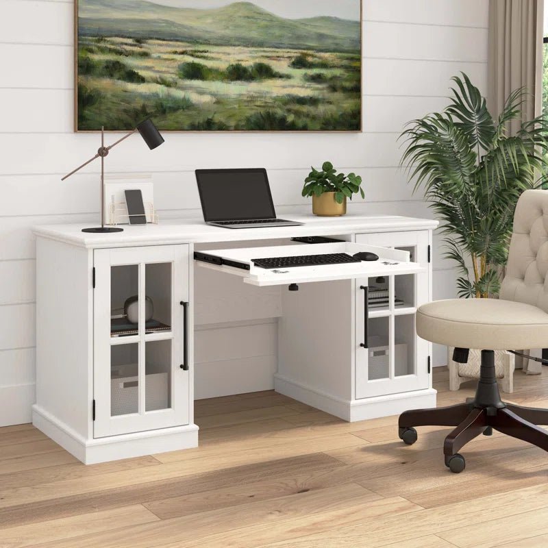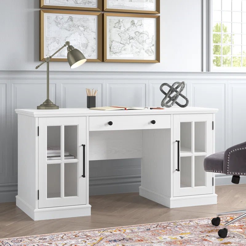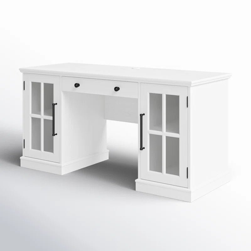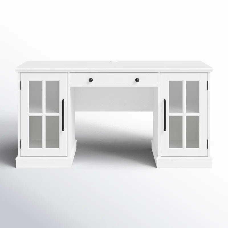 This executive desk blends traditional cottage style with modern functionality, making it a perfect addition to any office or home workspace. Crafted from engineered wood with a sleek, crisp white finish, the desk offers a spacious workspace, just under 5 feet wide, ideal for multitasking, computer work, or writing. The rectangular surface allows ample room for a reading lamp and personal decor, adding to its aesthetic appeal. Designed with built-in wire management, the desk helps you keep cables and devices organized and tangle-free, ensuring a tidy and efficient workspace.The desk also features a small drawer located underneath, designed to store your keyboard, maintaining a clutter-free desktop. Two cabinets with windowpane glass doors offer a classic touch while providing convenient storage for office accessories, files, or paperwork. This functional yet stylish desk is perfect for those looking to enhance their office space with a touch of elegance and practicality. Product Specifications Dimensions: 29.5” H x 76.4” W x 19.7” D Material: Engineered wood Finish: Crisp white Workspace Area: Spacious, just under 5 feet wide Wire Management: Built-in system for organized charging Storage: Small drawer for keyboard storage and two cabinets with windowpane glass doors Style: Traditional cottage aesthetic Assembly: Some assembly required Q&A Q1: Is the desk easy to assemble?A1: Yes, the desk comes with clear assembly instructions and all necessary tools, making it relatively easy to put together. It may require two people for optimal assembly, especially when attaching the top surface. Q2: Can the cabinets hold large files or binders?A2: The cabinets are spacious and can easily accommodate standard-sized files, office accessories, and some larger items. However, they are not specifically designed for heavy-duty storage, so it’s ideal for keeping documents and light office materials. Q3: Can I customize the color or size of this desk?A3: Currently, the desk is available only in the crisp white finish and the specified size. For customization options, including alternative colors or sizes, please contact customer support. For more information and customization, contact customer support at +91 9548357283.Timing: Monday to Saturday – 10 AM to 7 PM.