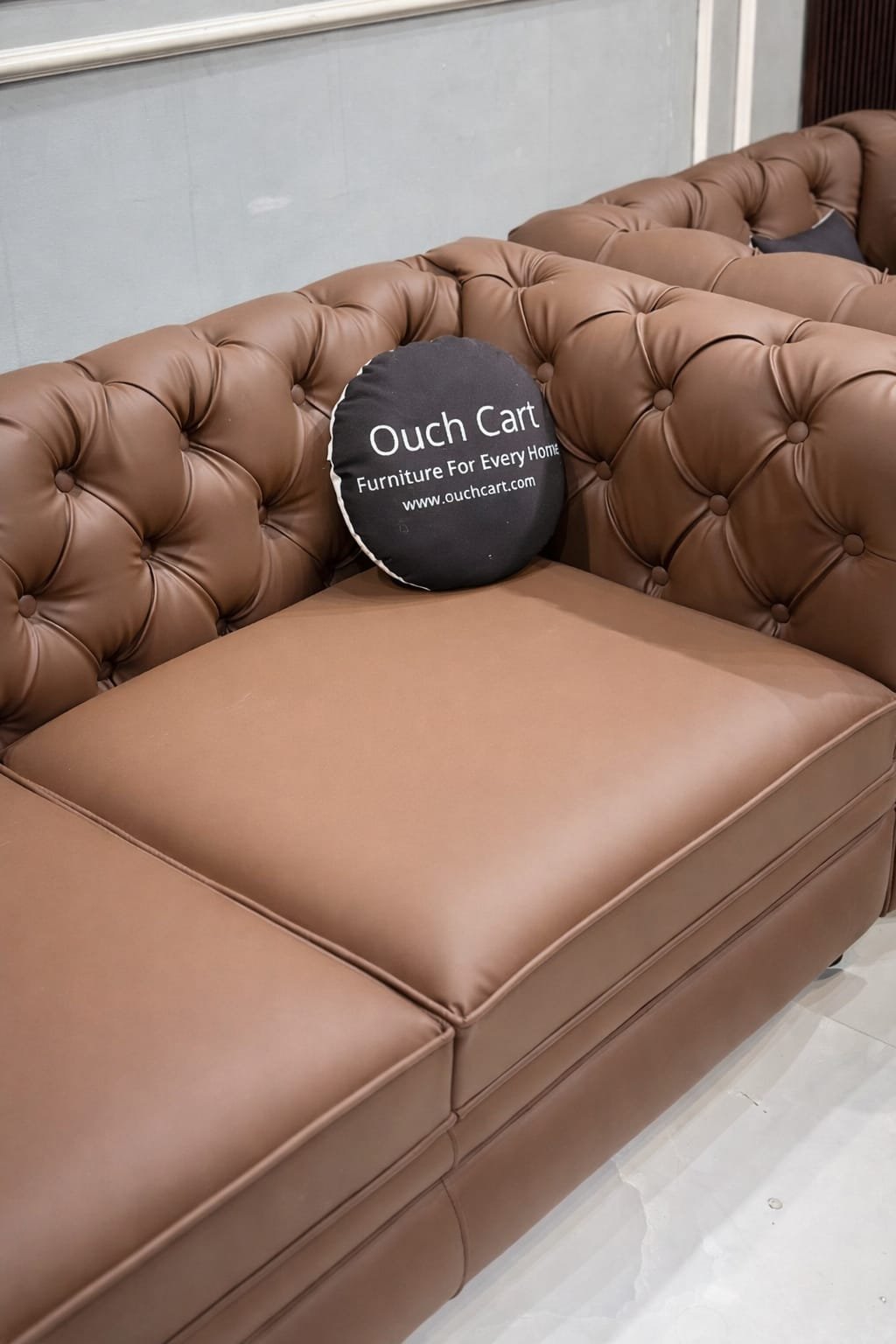 Product Description Elevate your living space with this luxurious Chesterfield Sofa Set by Ouch Cart, designed to deliver timeless elegance and exceptional comfort. Featuring a classic button-tufted design with rolled arms, this sofa set blends traditional craftsmanship with modern refinement—perfect for upscale homes, offices, or lounge areas. Upholstered in premium-quality leather, the sofa offers a rich texture, long-lasting durability, and easy maintenance. Deep cushioning and a sturdy internal frame ensure superior seating comfort and reliable support for everyday use. The warm, sophisticated tone adds a statement of luxury while seamlessly complementing both contemporary and classic interiors. This set includes a spacious 3-seater sofa and matching single-seater armchairs, making it ideal for creating a cohesive and inviting seating arrangement. Whether placed in a living room, reception area, or executive office, this Chesterfield sofa set reflects refined taste and enduring style. Dimensions 3-Seater Sofa Height: 33 in Length: 79 in Width: 33 in Single-Seater Armchair Height: 33 in Length: 39 in Width: 33 in For more information and customization, contact customer support at +91 9548357283. Timing: Monday to Saturday – 10 AM to 7 PM.