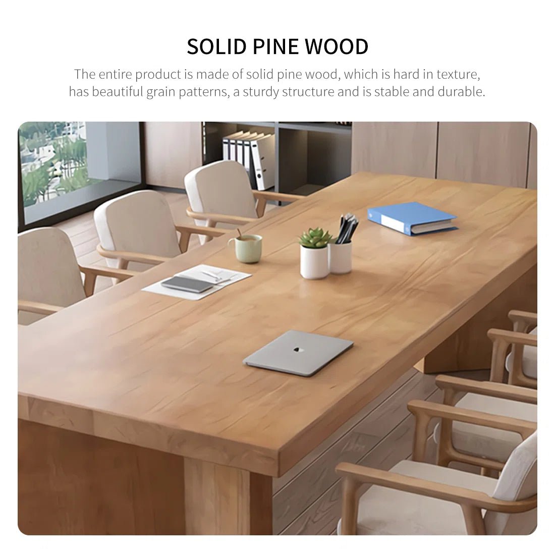 This minimalist solid-wood conference table exudes natural charm and seamlessly fits into a variety of spaces. Crafted from high-quality solid pine, it is thick, durable, and features a beautiful grain with a sturdy structure. Finished with water-based paint, it’s eco-friendly and colorfast. The spacious tabletop and uniquely shaped solid-wood legs provide exceptional comfort and stability.